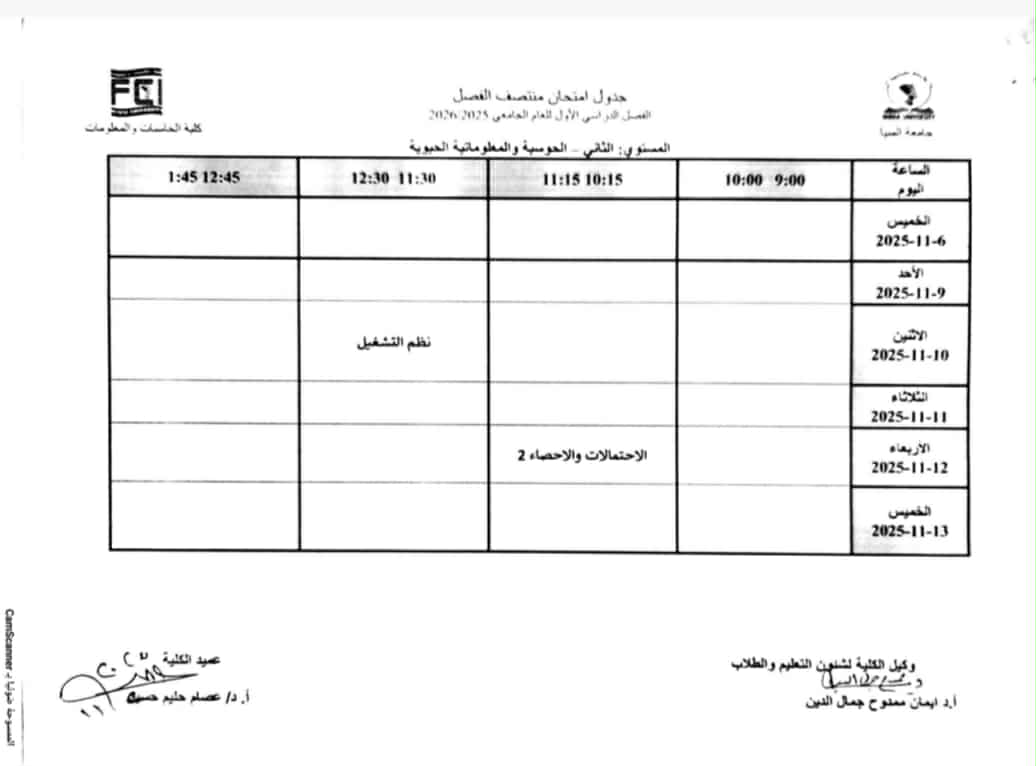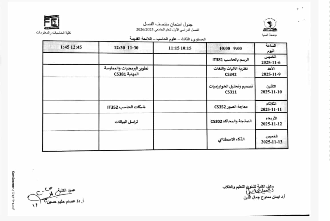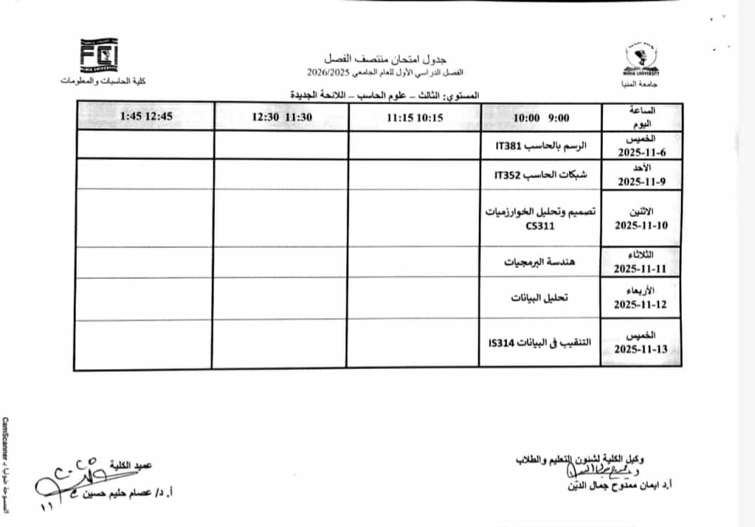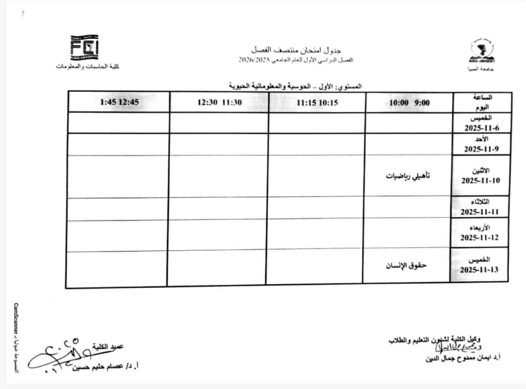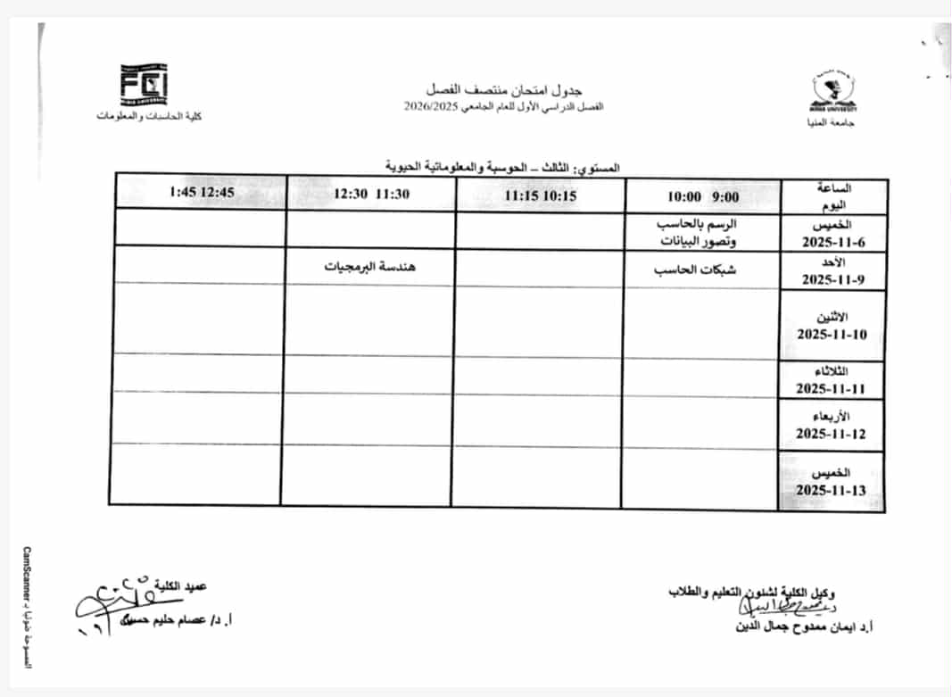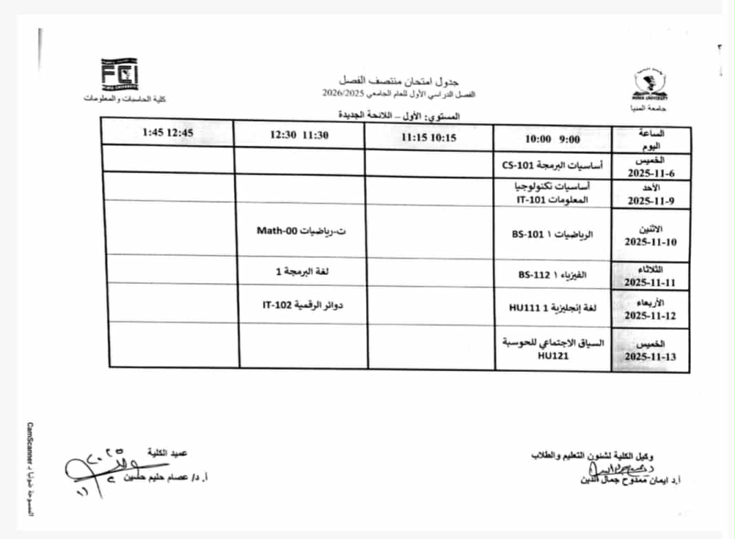 جدول امتحانات منتصف الفصل الدراسى الاول للعام الجامعى 2025/2026