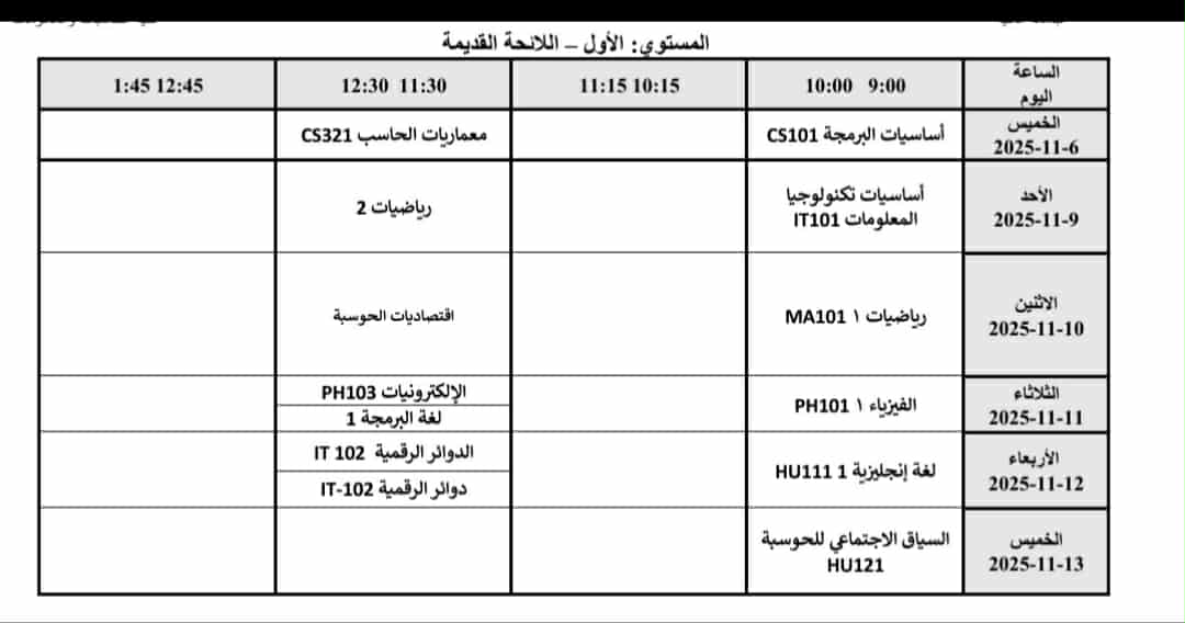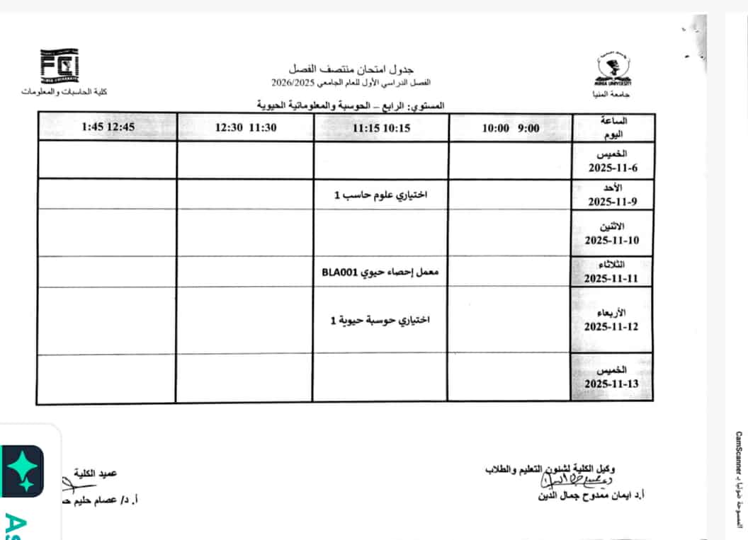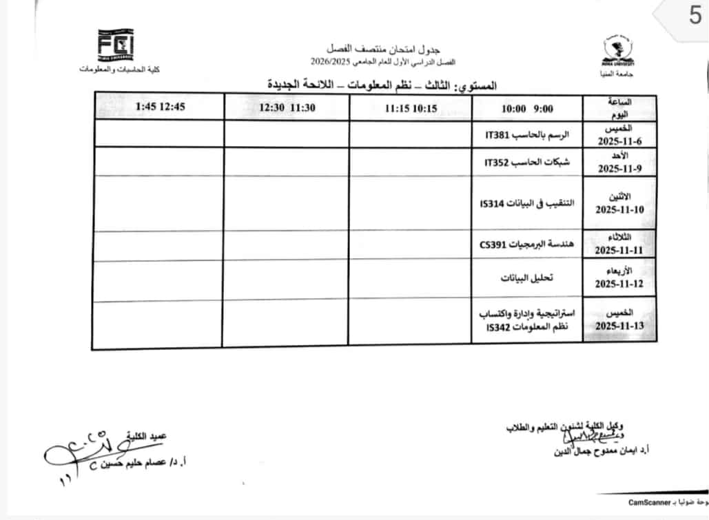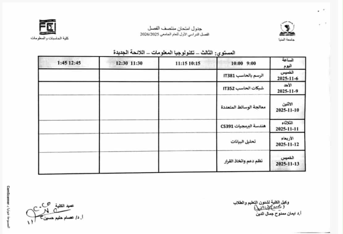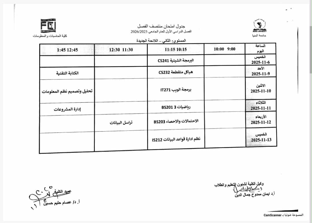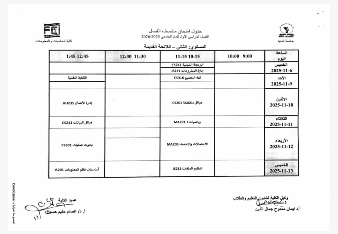 جدول امتحانات منتصف الفصل الدراسى الاول للعام الجامعى 2025/2026