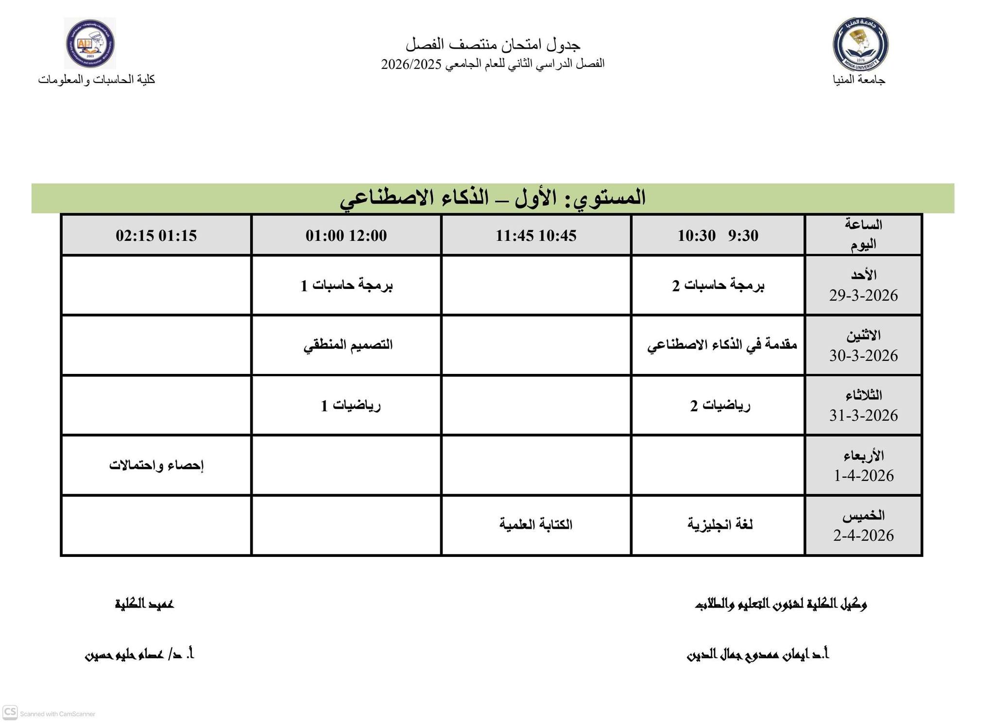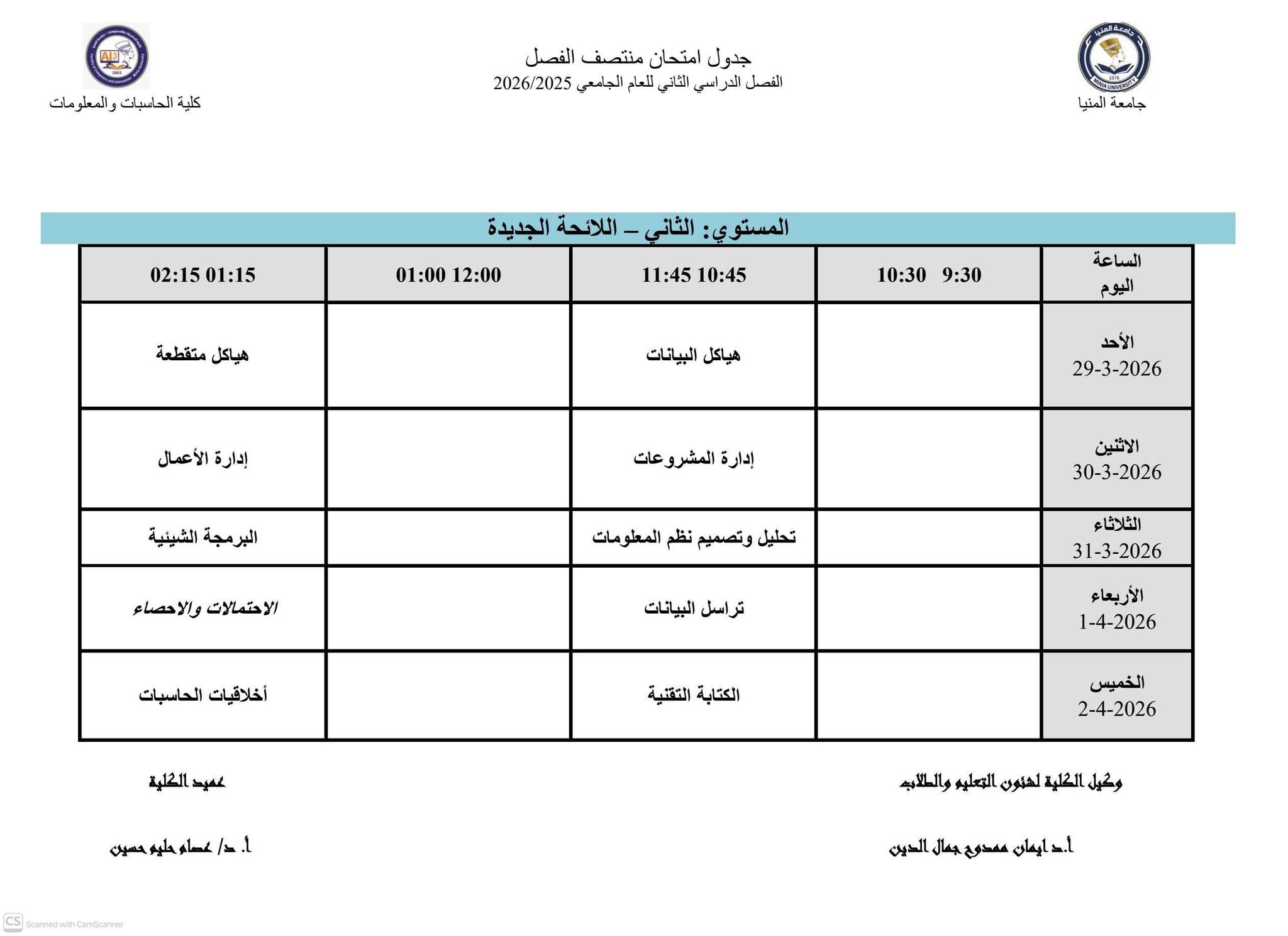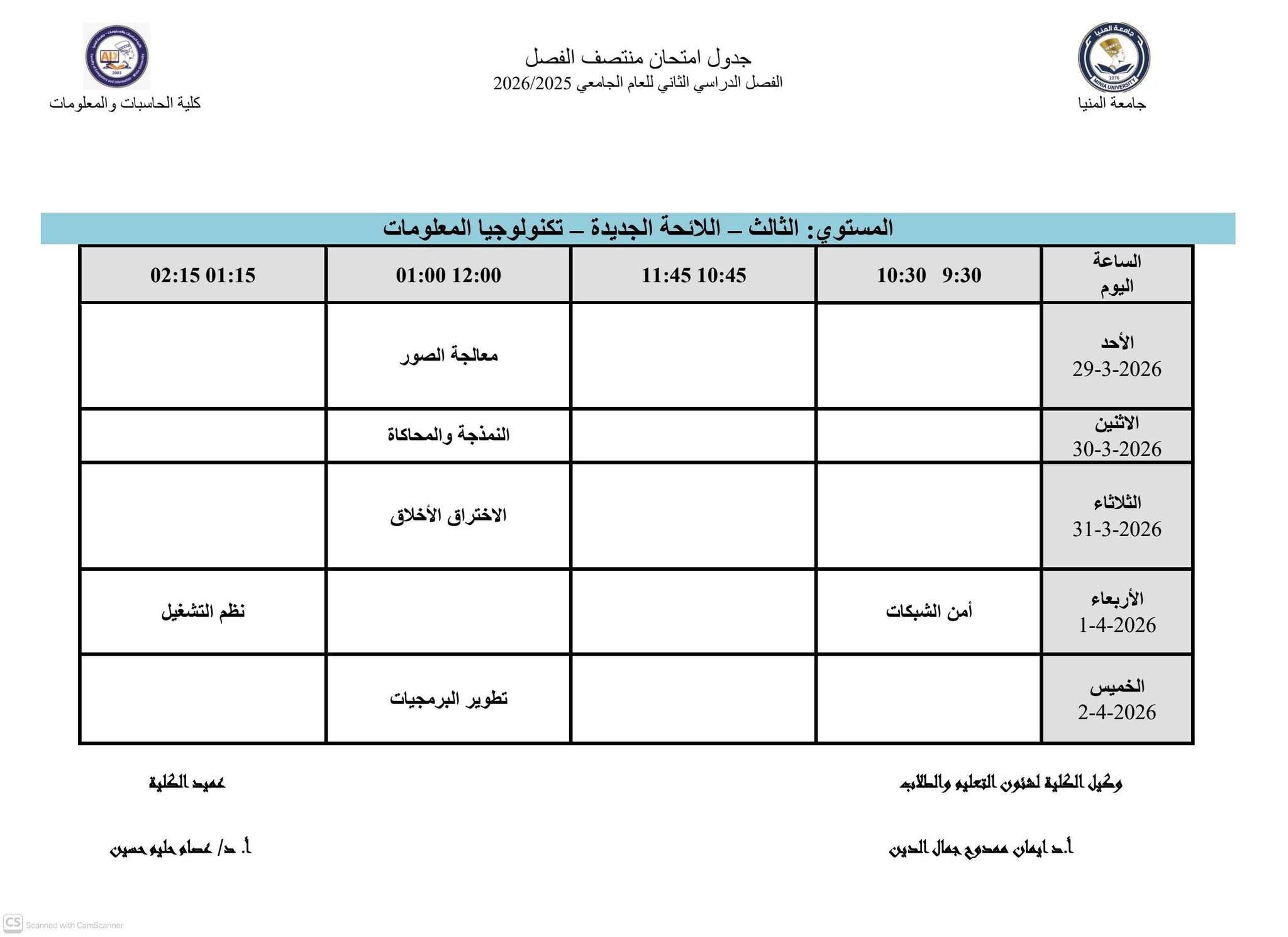 جدول امتحانات منتصف الفصل الدراسي الثاني "الميدتيرم" لجميع الفرق الدراسية (العام والبرامج المميزة )