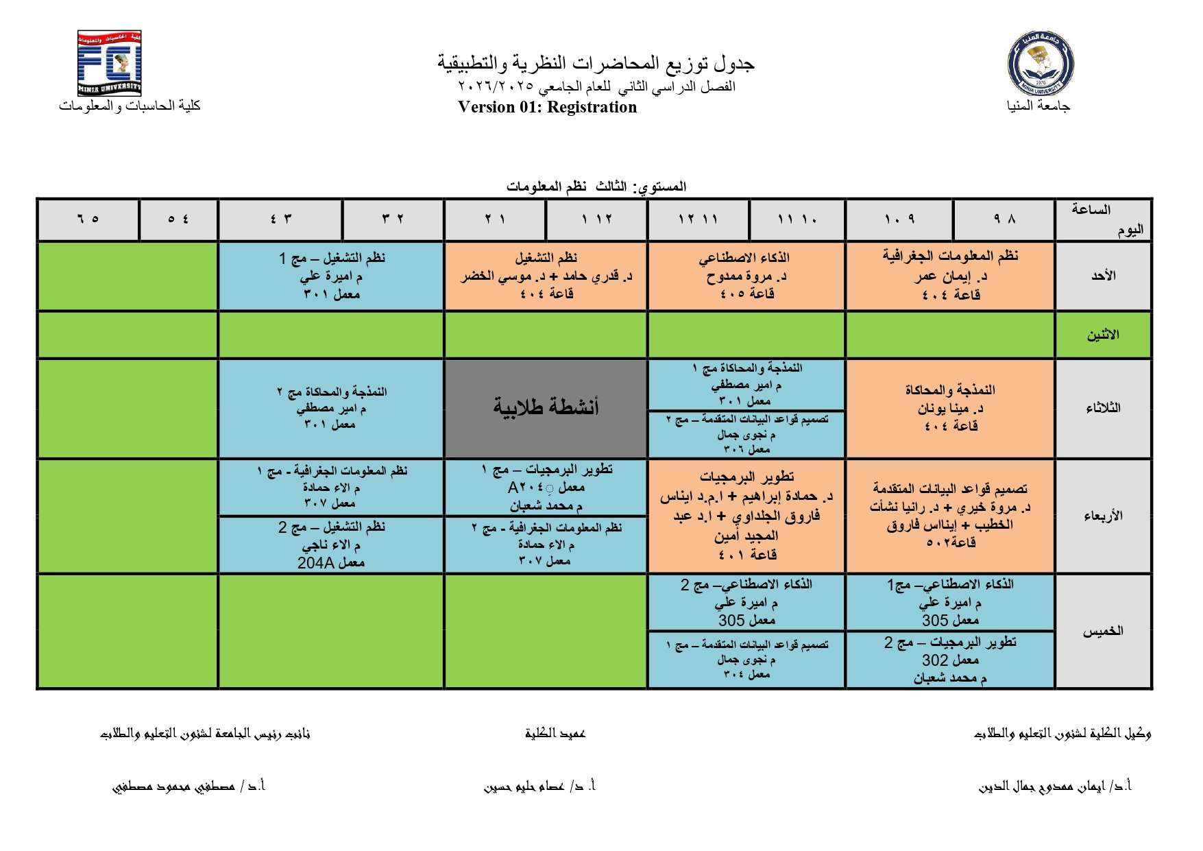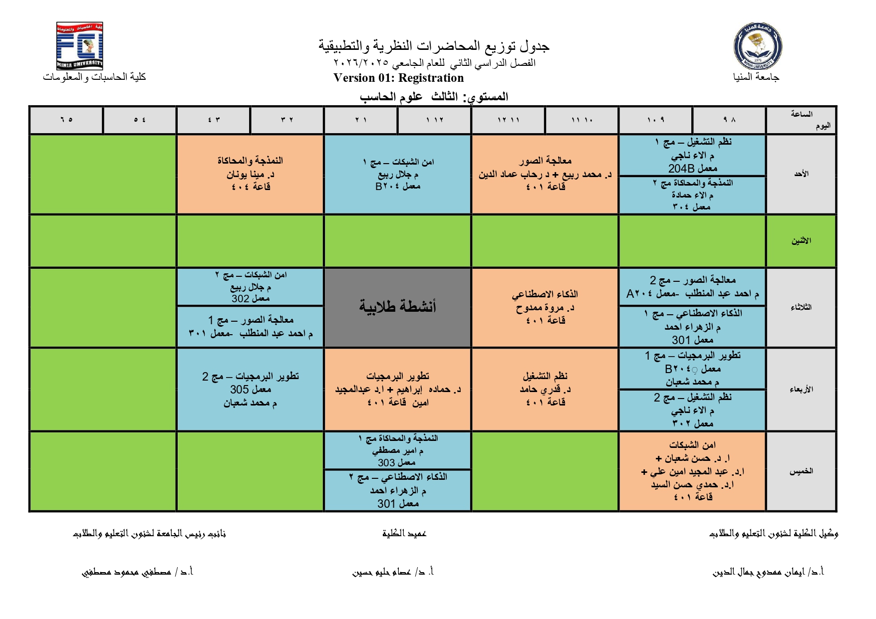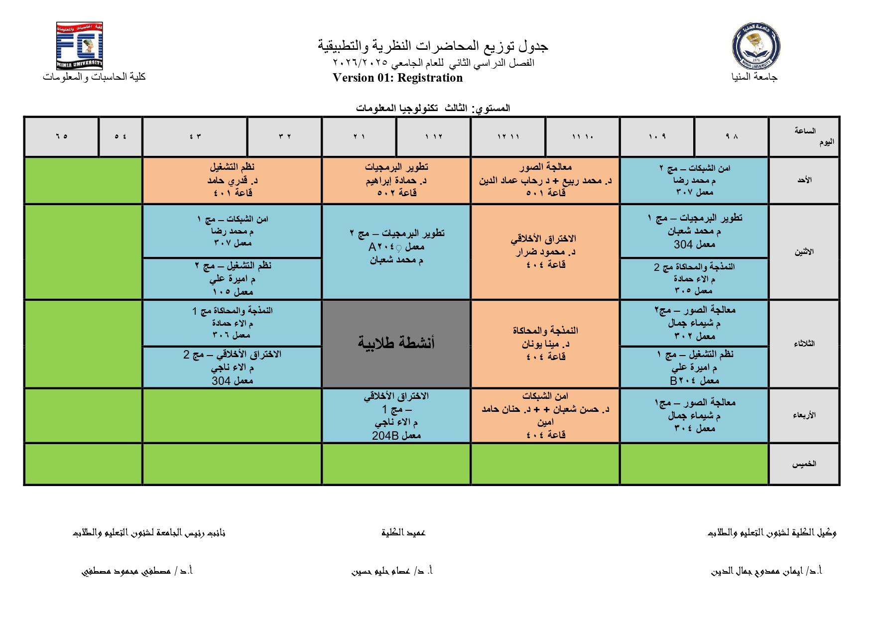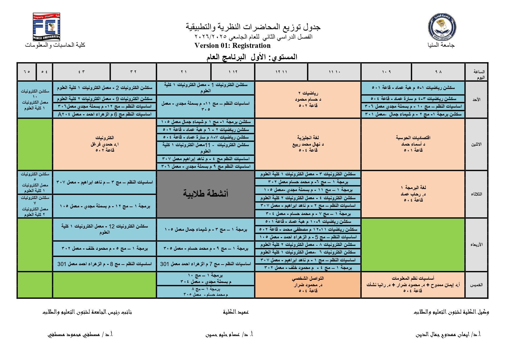جدول محاضرات الفصل الدراسى الثانى للعام الجامعى 2025/2026