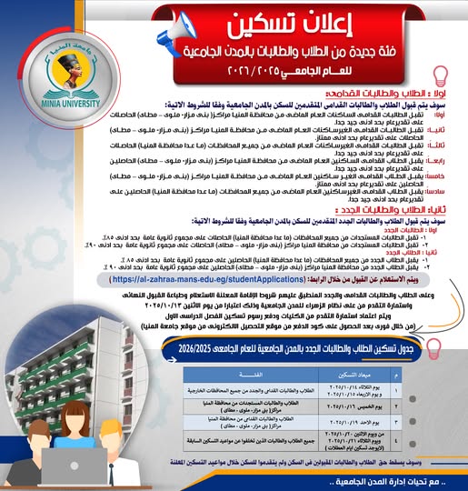 إعلان تسكين فئة جديدة من الطلاب والطالبات بالمدن الجامعية للعام الجامعي 2025 - 2026